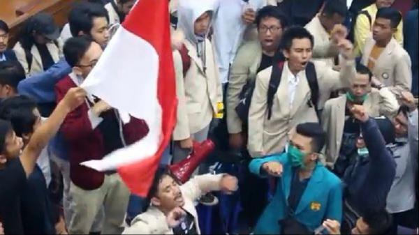 Mahasiswa di Garut menggelar unjuk rasa di dalam Ruang Sidang Paripurna DPRD setempat. (Foto: iNews).