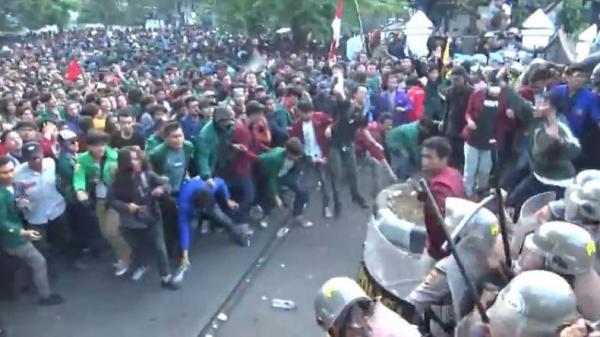 Polisi berusaha menghalau para mahasiswa agar mundur dan kembali berorasi dengan tertib saat demonstrasi di depan Gedung DPRD Jabar, Senin (24/9/2019). (Foto: iNews)