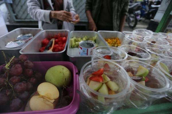 Sop buah, potongan berbagai macam buah yang disajikan dengan gula cair dan tambahan susu. (Foto: iNews/Yogi Pasha)