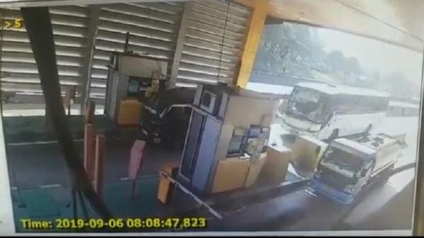 Detik-detik saat bus Primajasa akan menabrak bagian belakang mobil Elf di Gerbang Tol Cikamuning, Kabupaten Bandung Barat, Jabar, Jumat (6/9/2019). (Foto: iNews.id/Yuwono)