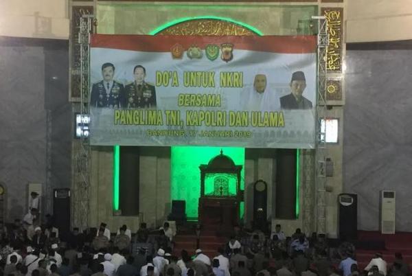 BANDUNG, iNews.id – Sedikitnya 20.000-an orang menghadiri acara ‘Doa Bersama Untuk NKRI’ di Masjid Raya Bandung, Jalan Dalem Kaum Nomor 14, Balonggede, Regol, Kota Bandung, Jawa Barat, Kamis malam (17/1/2019). Dalam kegiatan itu, Panglima TNI Marsekal TNI Hadi Tjahjanto dan Wakapolri Komjen Pol Ari Dono Sukmanto turut hadir bersama personel TNI dan Polri se-Garnisun Tetap II/Bandung, serta masyarakat umum.