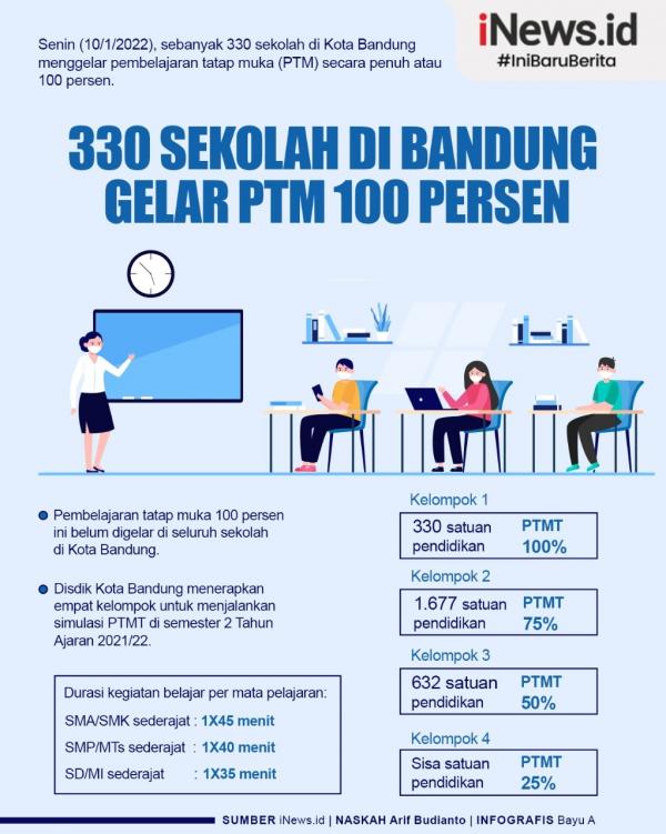 BANDUNG, iNews.id - Hari ini, Senin (10/1/2022), sebanyak 330 sekolah di Kota Bandung menggelar pembelajaran tatap muka (PTM) secara penuh atau 100 persen. Pembelajaran tatap muka 100 persen ini belum digelar di seluruh sekolah di Kota Bandung.