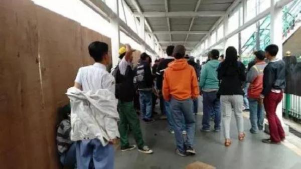 Pelajar asal Bogor tertahan di stasiun saat hendak berangkat ke Jakarta untuk ikut unjuk rasa. (Foto: Okezone).