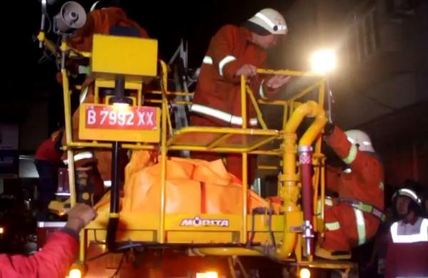 Setelah tiga jam berjibaku untuk mengendalikan api, petugas damkar akhirnya berhasil mengendalikannya. Mereka selanjutnya mengevakuasi dua korban yang diketahui terjebak di bagian atas bangunan tersebut.