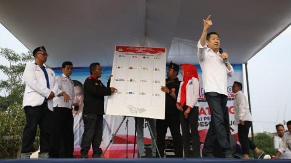 Pada peresmian kantor yang megah tersebut, HT juga mengajak seluruh masyarakat untuk menggunakan hak pilihnya. Dia pun mengajarkan cara memilih Partai di panggung.