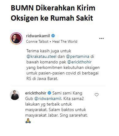 “Terima kasih juga untuk @krakatau.steel dan @pertamina di bawah komando pak @erickthohir yang berkomitmen kebutuhan oksigen untuk pasien-pasien covid di berbagai RS di Jawa Barat,” tulis Kang Emil dalam laman Instagram miliknya.