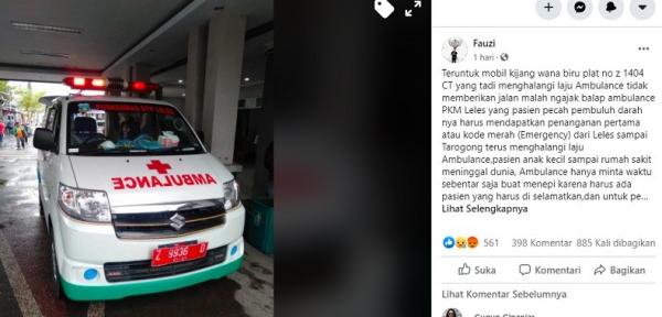 Dalam unggahanya, Fauzi menyebut ambulans Puskesmas Leles yang membawa pasien anak kecil dihalangi mobil Kijang biru. Selain menghalangi laju ambulans, Fauzi juga menyebut pengendara mobil Kijang mengajak sopir ambulans balapan di jalan.